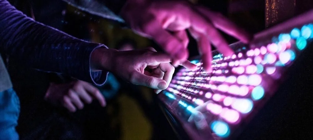 Laser Light Synths is a large-scale outdoor interactive light installation that gives members of the public the chance to feel the exhilaration of performing live music. It features 4 custom-made super bright LED emblazoned synths, and powerful lasers projecting visuals that respond to the music and cover the building with shimmering dancing lights.