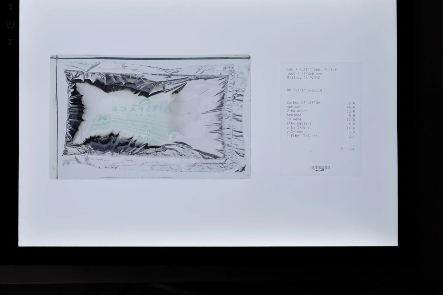 Air cushions, as they are being delivered as part of Amazon orders or other online retailers, are generally being inflated at the very moments the order is being fulfilled with the ambient room air from the warehouse. Each shipping box thus carries with it a “sample” of the work situation and environment, which is generally hidden to us (online) consumers. In his work, Gottfried Haider reconstructs this situation quasi forensically through means of air analysis, performed by a scientific lab, which identifies the specific organic compounds in samples received from different warehouses. Most of those compounds are classified as irritants, health or environmental hazards. In each case, a synthetic resin cast permanently preserves a cushion containing a sample of air – and thus an “echo of labor”. The enclosed results of the air analysis allow conclusions about the specific conditions in the Fulfillment Centers at the time of shipment. The work exist as a series for a number of Amazon locations in the western United States. A single-channel video is re-tracing the path of the shipped air.