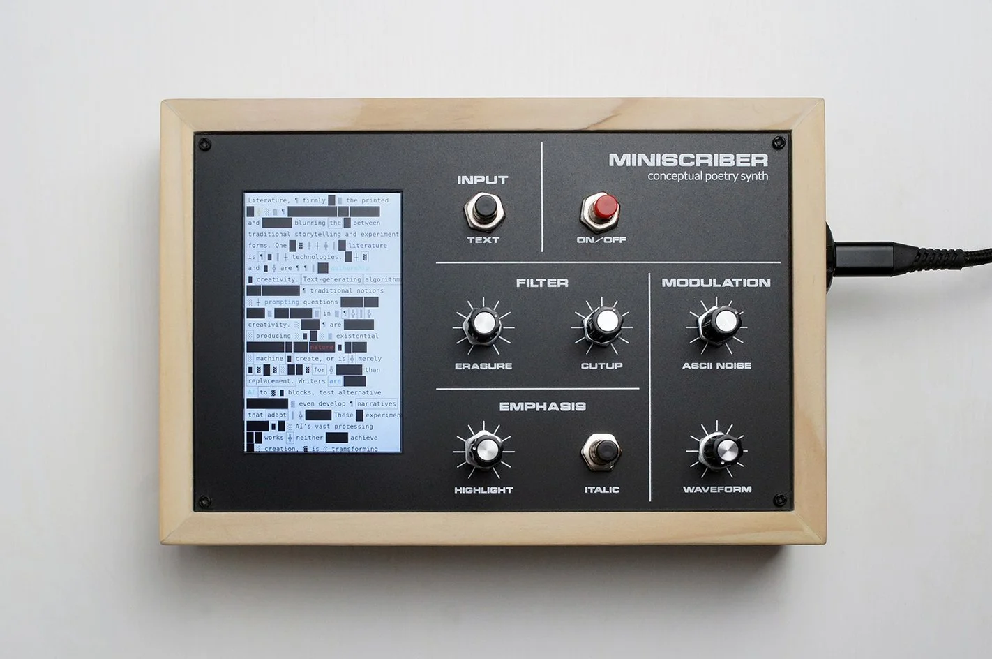 The Miniscriber is a conceptual poetry synth: a physical machine that turns reader-viewers into word jockeys who can sample and sculpt words into digital, visual poems. A literary device that fosters a conceptual, critical, contemporary engagement with text.