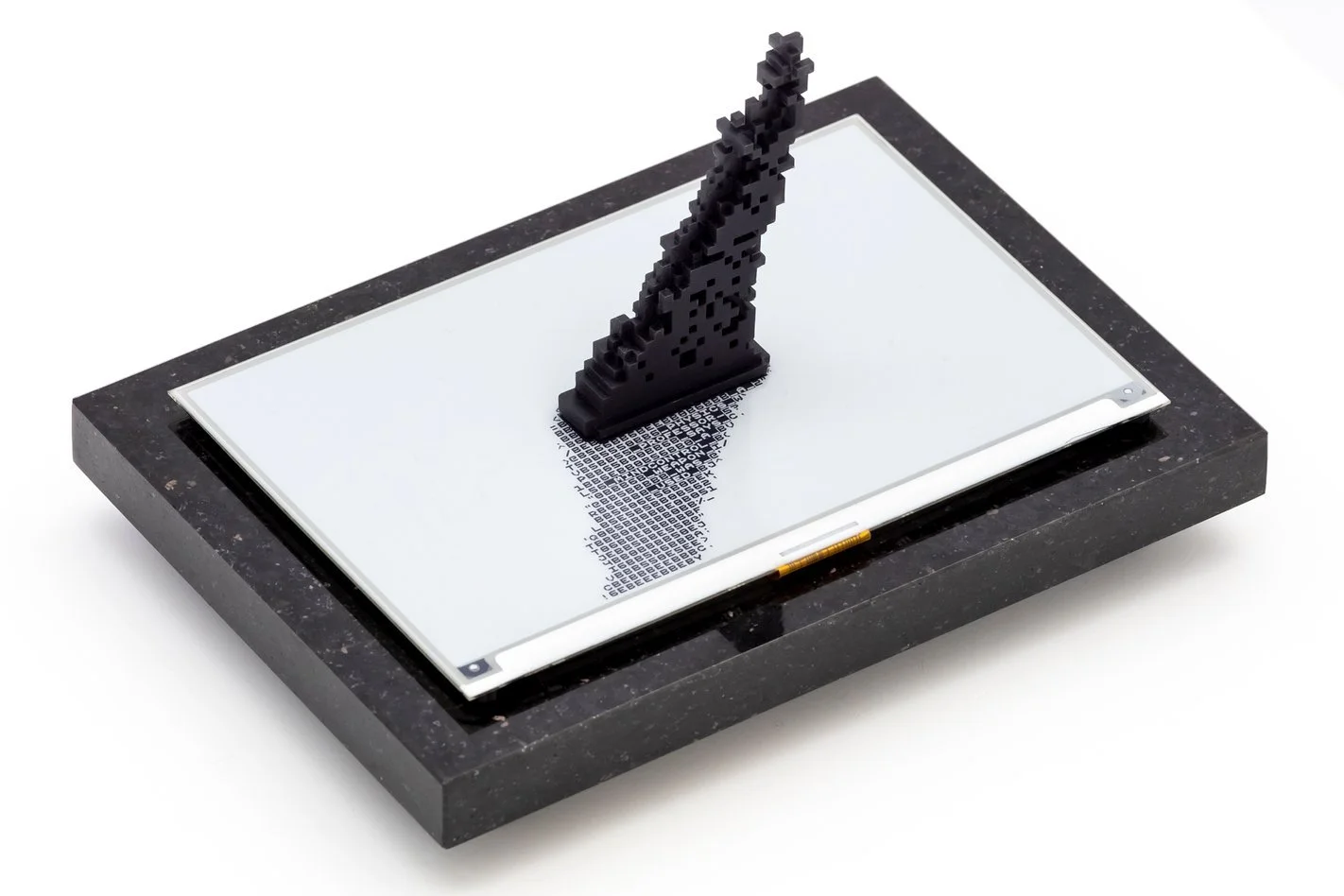 SHADOW OF DOUBT https://jkozniewski.com/works/shadow_of_doubt/ The augmented reality (AR) is one of those hyped-up terms that seems to become persistent in our collective imagination of the near future - mostly thanks to big tech media conglomerates like Meta and their restless attempts to put the eye-candy blinds onto our eyes, immersing us in so called metaverse. Ironically the same social platform is responsible for dissemination of all sorts of fake news and misinformation - thus in fact right now augmenting the perception of shared reality. The sculpture works by combining a 3d-printed form resembling a sundial gnomon that's attached onto the surface of the e-paper screen. Since I have an exact 3d model of the physical object I'm then able to generate an augmented ray-traced shadow (using old school open source pov-ray engine) that is displayed on the e-paper display according to current time of day and (intentionally) wrong sun position at any given coordinates as if it's casted by the actual object. The final step is to convert the black and white image of the shadow into a grid of custom-designed pixel font characters in the vein of ASCII art and fill it with the words coming from latest fake news headlines sourced via Google Fact Check API - thus generating never ending stream of misinformation casting the ever-changing 'shadow of doubt' augmenting the reality of the sculpture itself. This data-driven object combines tradition of concrete poetry with new media and current context of post-truth society and misinformation.