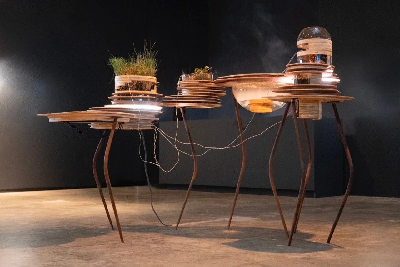 Being hyphaenated (Ser hifanizado) is an artwork-as-ecosystem that performs complex interactions between the planet’s living beings. Hyphae references the mycelial filaments that fungi use to communicate. In nature, fungi connect with each other and with other species through signaling sent by their hyphae. The sculpture comprises an array of living beings, each host to microorganisms which are connected to each other through respiration and are mediated by sensing technology.