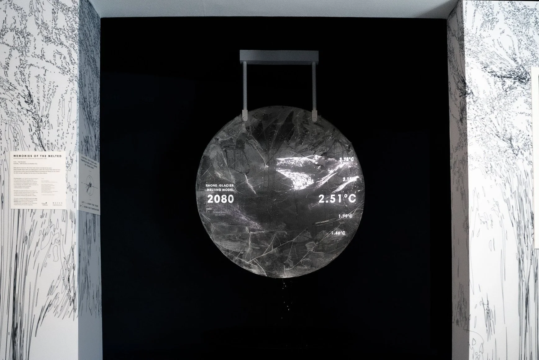 Memories of the Melted' is a two‑part artwork that turns the disappearing Rhône Glacier into living memory. At its core stands a clear ice‑like slab suspended above a basin. Onto this surface a real‑time generative model of the glacier is projected. Visitors glide a hand to travel through time—from the 1890s blue bulk to the ghosted outline forecast for 2100. Raising or lowering the same hand changes temperature, and the slab audibly weeps faster as degrees climb, every drip paced to measured loss. Commissioned by the Villars Institute for the 2025 International Year of Glaciers, the work debuted just metres from the Rhône itself. Glaciologists Matthias Huss and Heidi Sevestre fed the model with glacier‑inventory records, elevation maps and IPCC SSP pathways to visualise three futures: fossil‑fuel, business‑as‑usual and sustainable. Its second life unfolds on stage: violinist SongHa Choi performs Bach fragments re‑harmonised for glacier futures. Live audio analysis maps her vibrato, pitch and rhythm to melt‑rate variables; each note nudges the water, stalls it or accelerates the flow. When she bows the fossil‑fuel passage the ice surface darkens and the projections vanish; in the sustainable reprise a faint frost returns. The duet of code and strings fuses fact and emotion, proving that collective choices—like individual notes—decide whether glaciers endure or vanish. Audiences leave with cold droplets on their fingertips and a renewed resolve to preserve the planet’s memory.