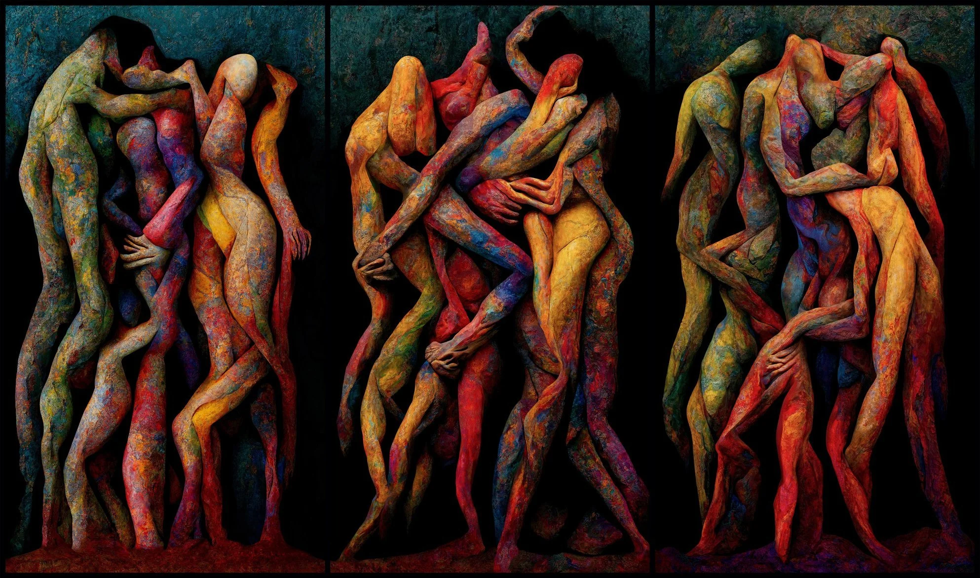 The triptych balances on the fine line between the surprise of closeness and the weight of interdependence. It conjures invisible yet tangible threads, where each being unveils their singularity while merging into a shifting, fluid collective. A humanity perpetually searching for harmony between self and other.