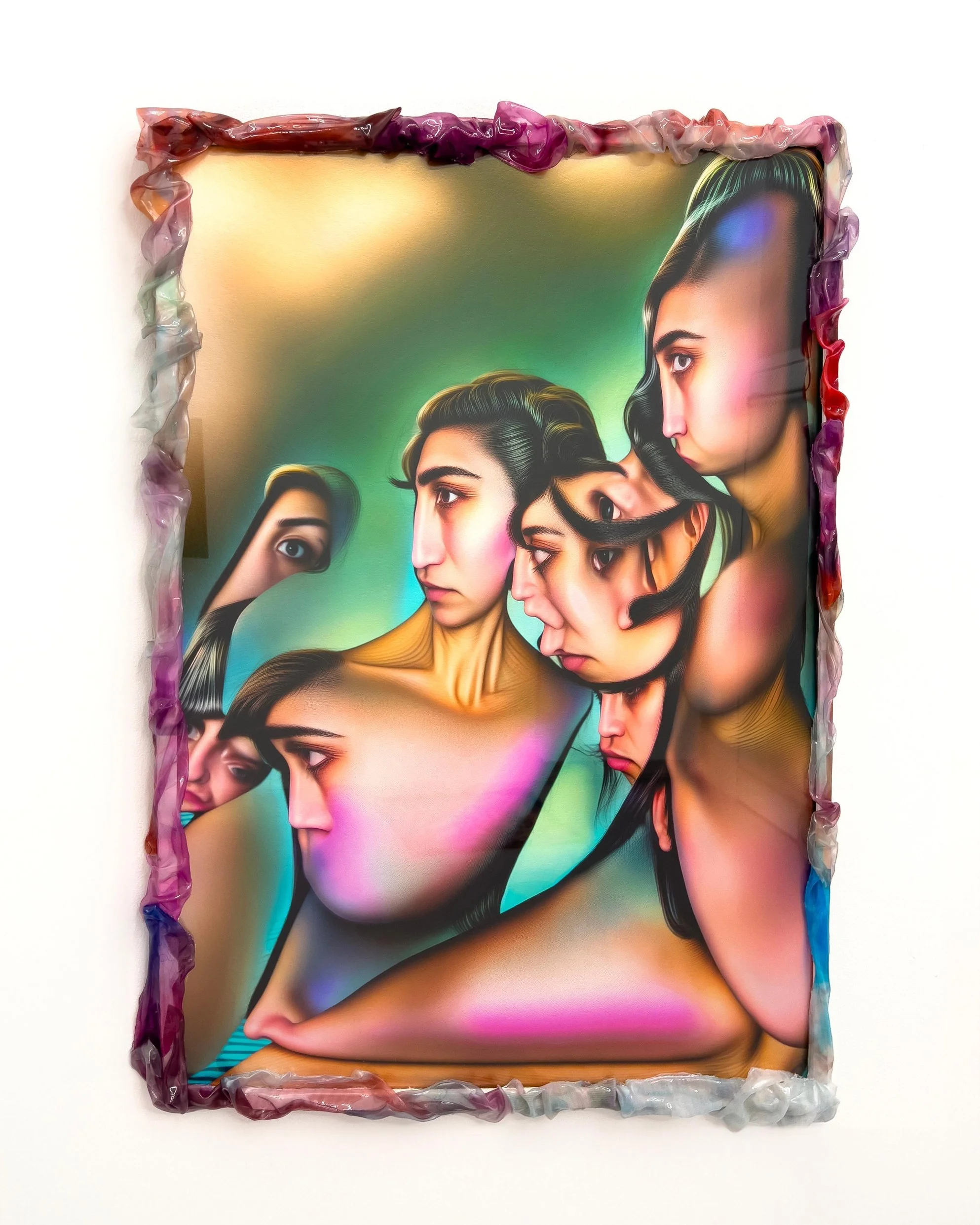 They are disturbingly unhinged and yet gracefully composed like icons. Printed on textured metallic paper and framed in glossy candy-like artist frames, the figures take on a sublime quality. Simultaneously exposed and obscured, these hypermediated beings are vulnerable yet threatening in their ambivalent visibility. First training AI models on images of her own face “face-swapped” with itself, the artist then processes candid photos through a combination of AI tools she coerces to recompose bodies entirely out of her reinterpreted face.